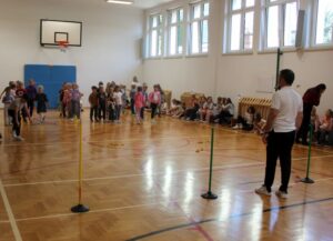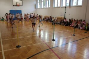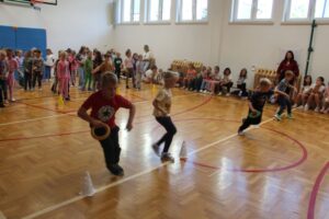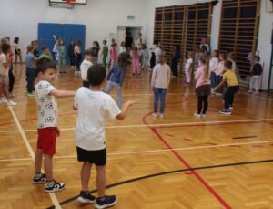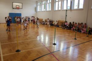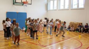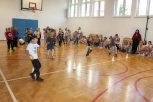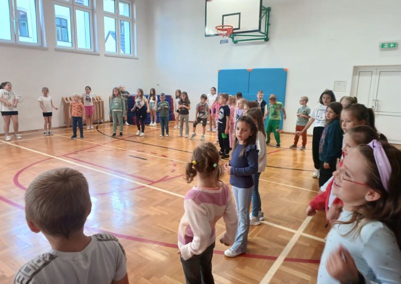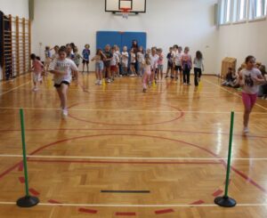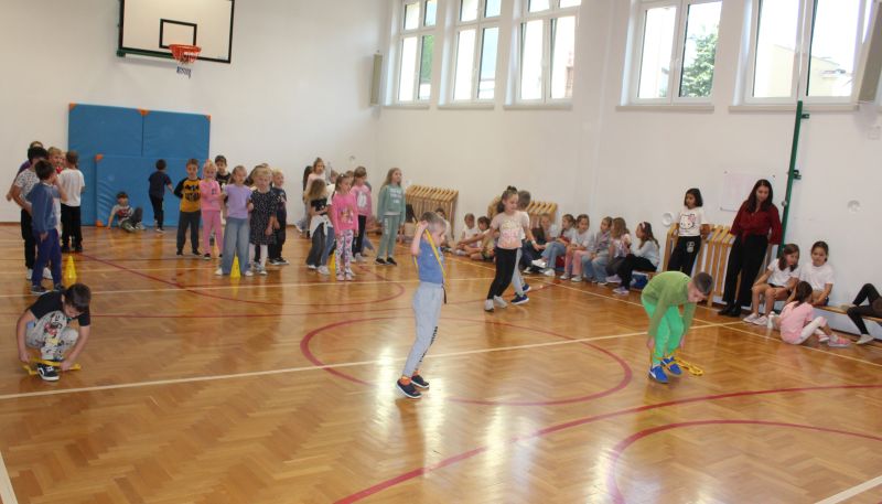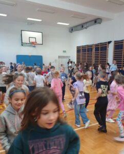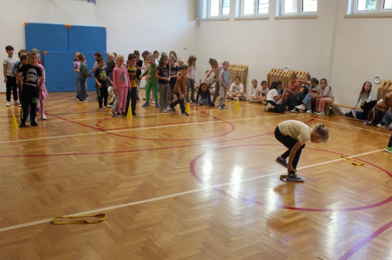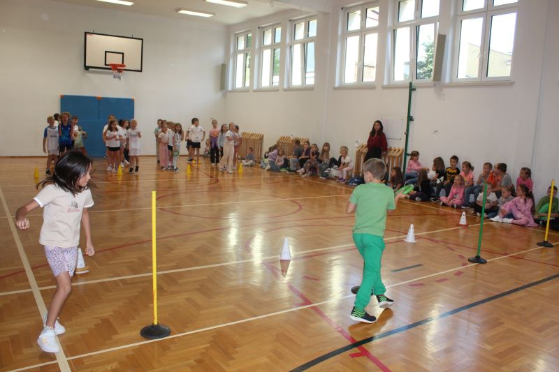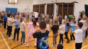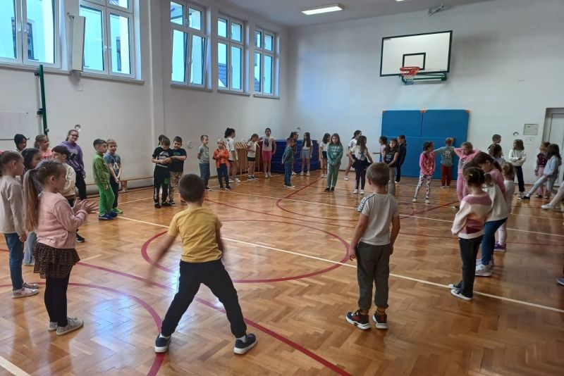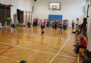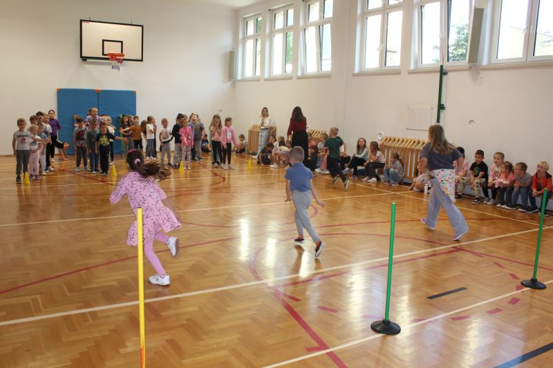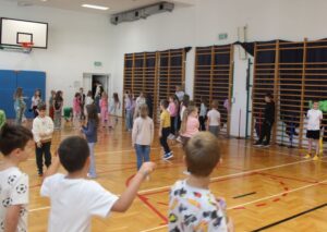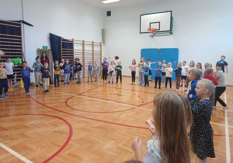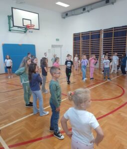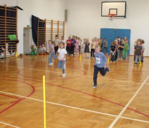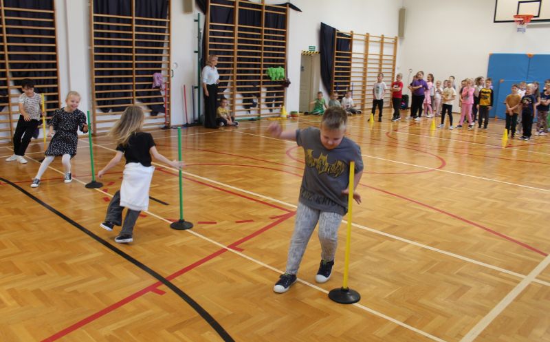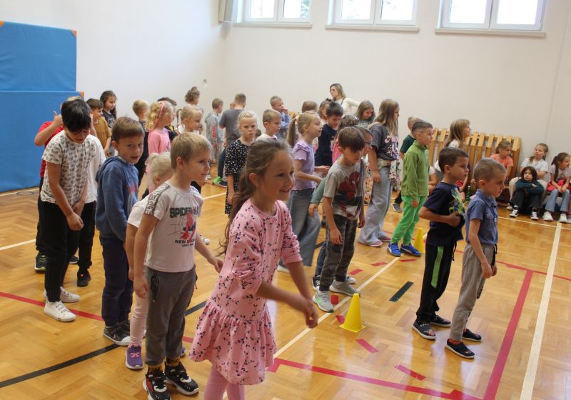 W naszej szkole został wprowadzony specjalny, aktywny harmonogram – „ruchomy plan lekcji”. Dla najmłodszych uczniów z klas I-II pod opieką wychowawczyń i nauczyciela wf został przeprowadzony festiwal aktywności na sali gimnastycznej. Dzieci poznały elementy rozgrzewki, którą poprowadzono przy muzyce, wykorzystując krok podstawowy polki. Wspaniała zabawa i integracja najmłodszych w drugiej części lekcji skupiona była na ruchu w różnych formach wyścigów rzędów.