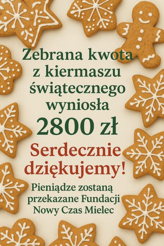 W dn. 9 grudnia 2025r. w naszej szkole odbył się charytatywny kiermasz słodkości. Na stołach znalazły się pyszne domowe wypieki: ciasta, ciasteczka, pierniczki i wiele innych smacznych rarytasów. Akcja przebiegła w bardzo miłej atmosferze i cieszyła się ogromnym zainteresowaniem. Cały dochód z kiermaszu zostanie przekazany na wsparcie Fundacji Nowy Czas w Mielcu.