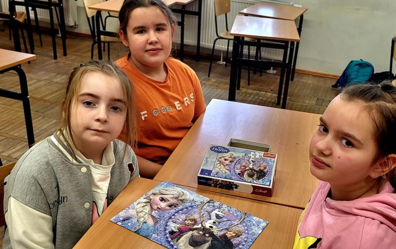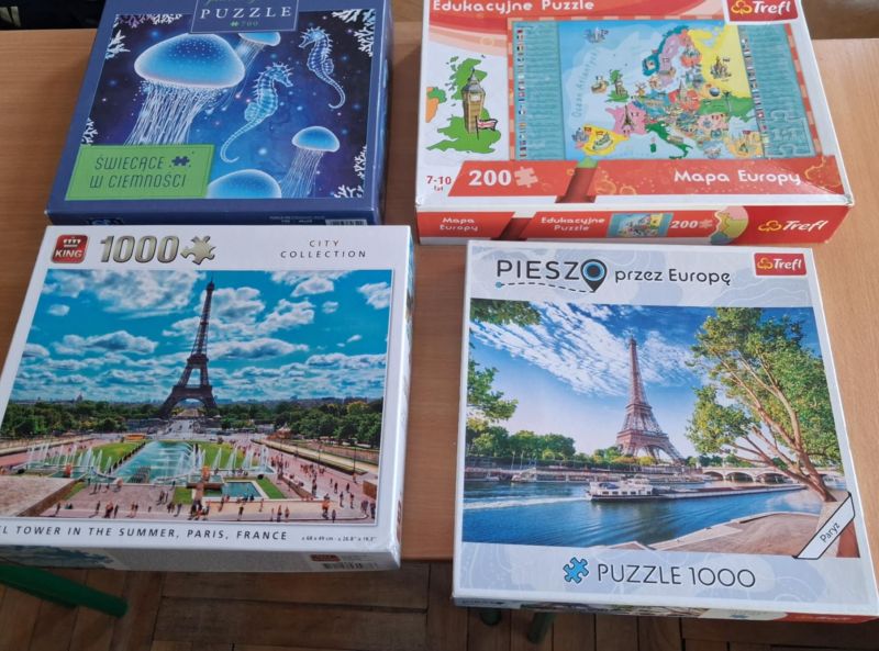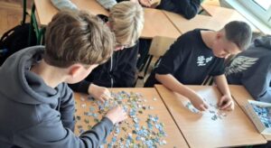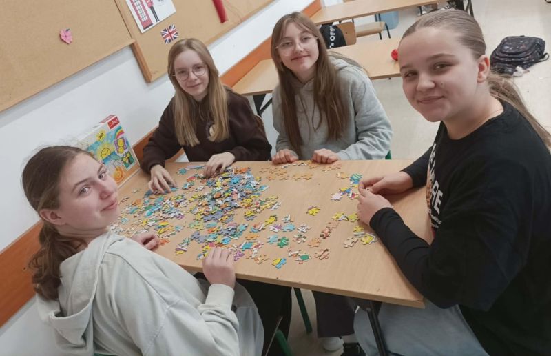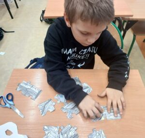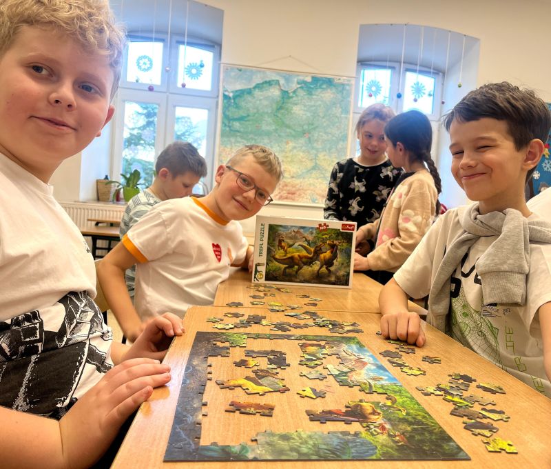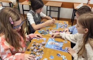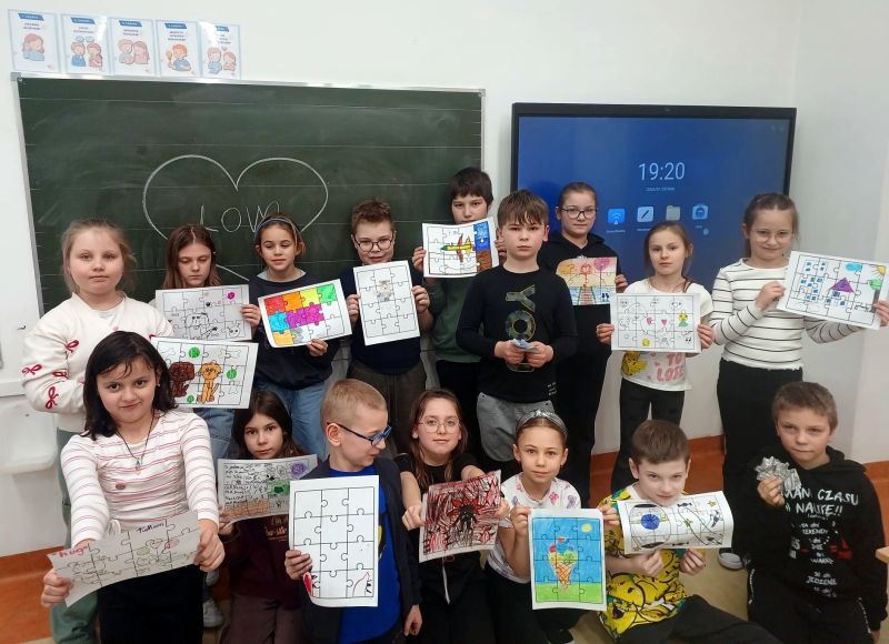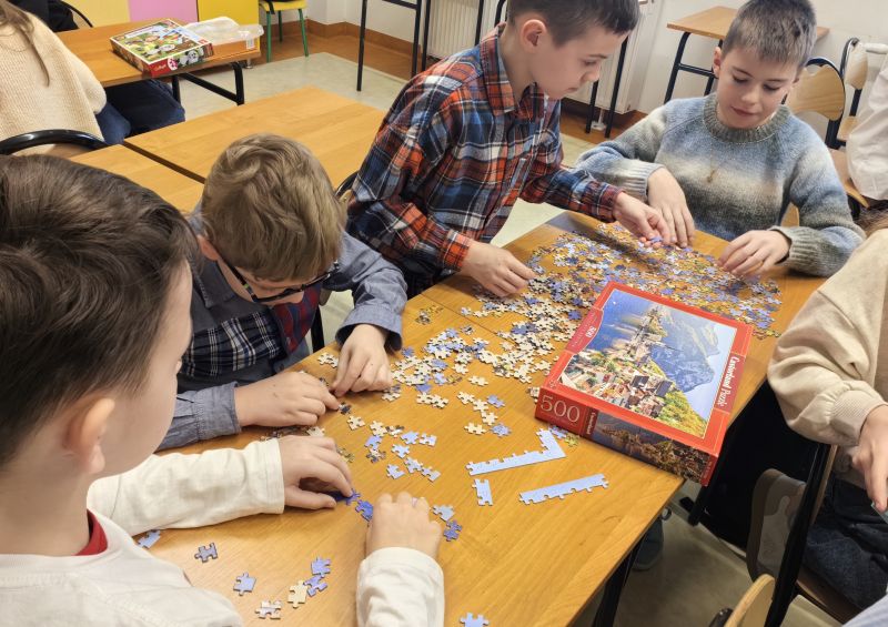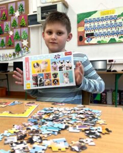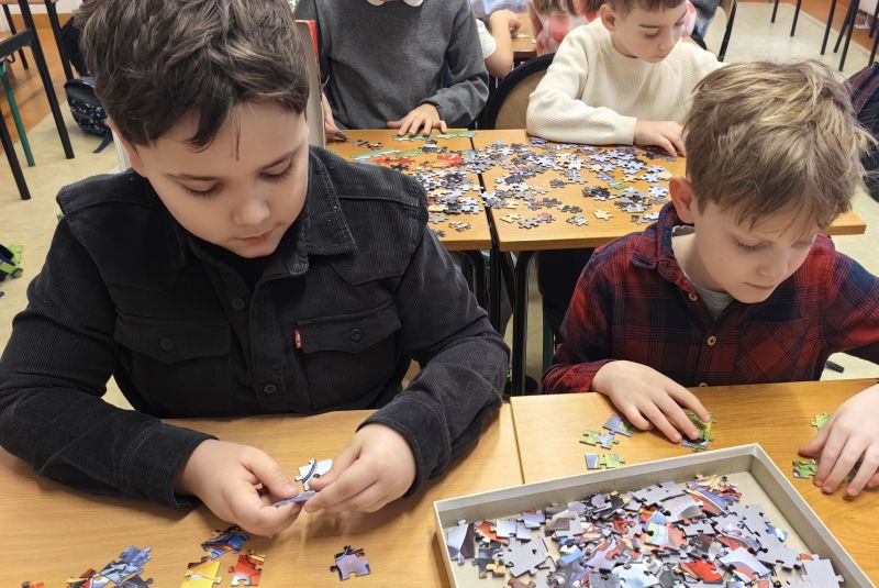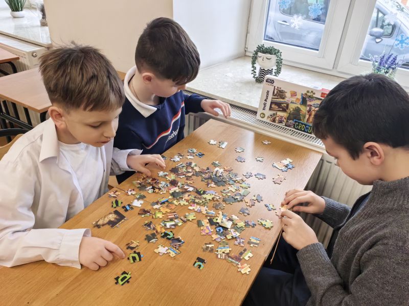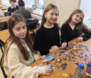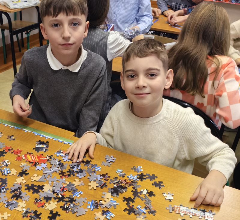 Uczniowie naszej szkoły bardzo chętnie włączyli się w tę akcję i wspólnie układali różne obrazki z małych kawałeczków. Wykonywali również swoje własne układanki.