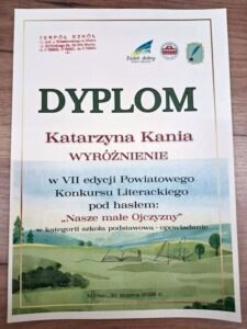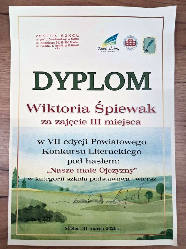 Miło nam poinformować, że Wiktoria Śpiewak z klasy VIIIa została laureatką tego konkursu, zdobywając trzecie miejsce za napisanie wiersza, natomiast Katarzyna Kania z klasy VIII b została wyróżniona za opowiadanie.