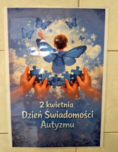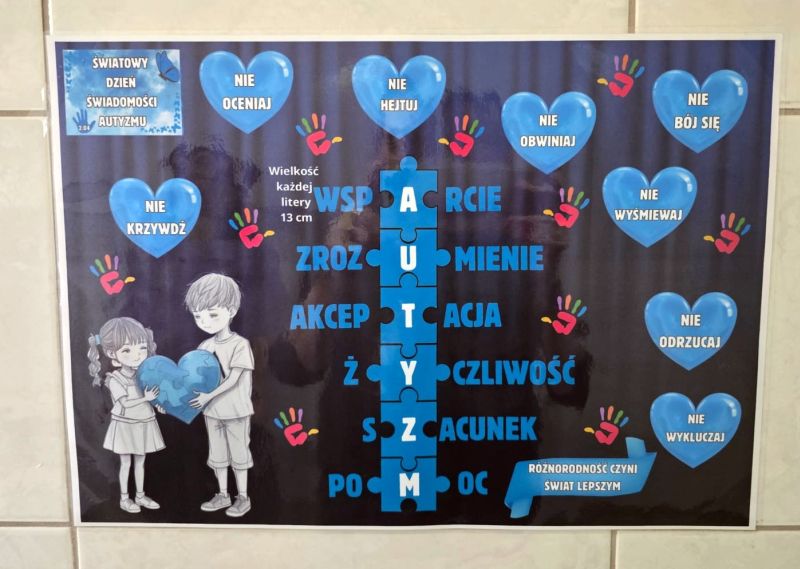 Na korytarzu szkolnym pojawiły się również plakaty informacyjne, które przybliżały temat autyzmu oraz pomagały zrozumieć codzienne wyzwania, z jakimi mierzą się te osoby.
